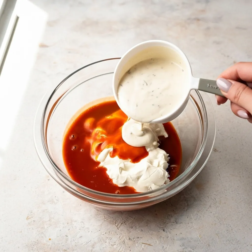In a mixing bowl, combine the softened cream cheese, hot sauce, and ranch dressing. Mix until mostly smooth (a few streaks are fine).