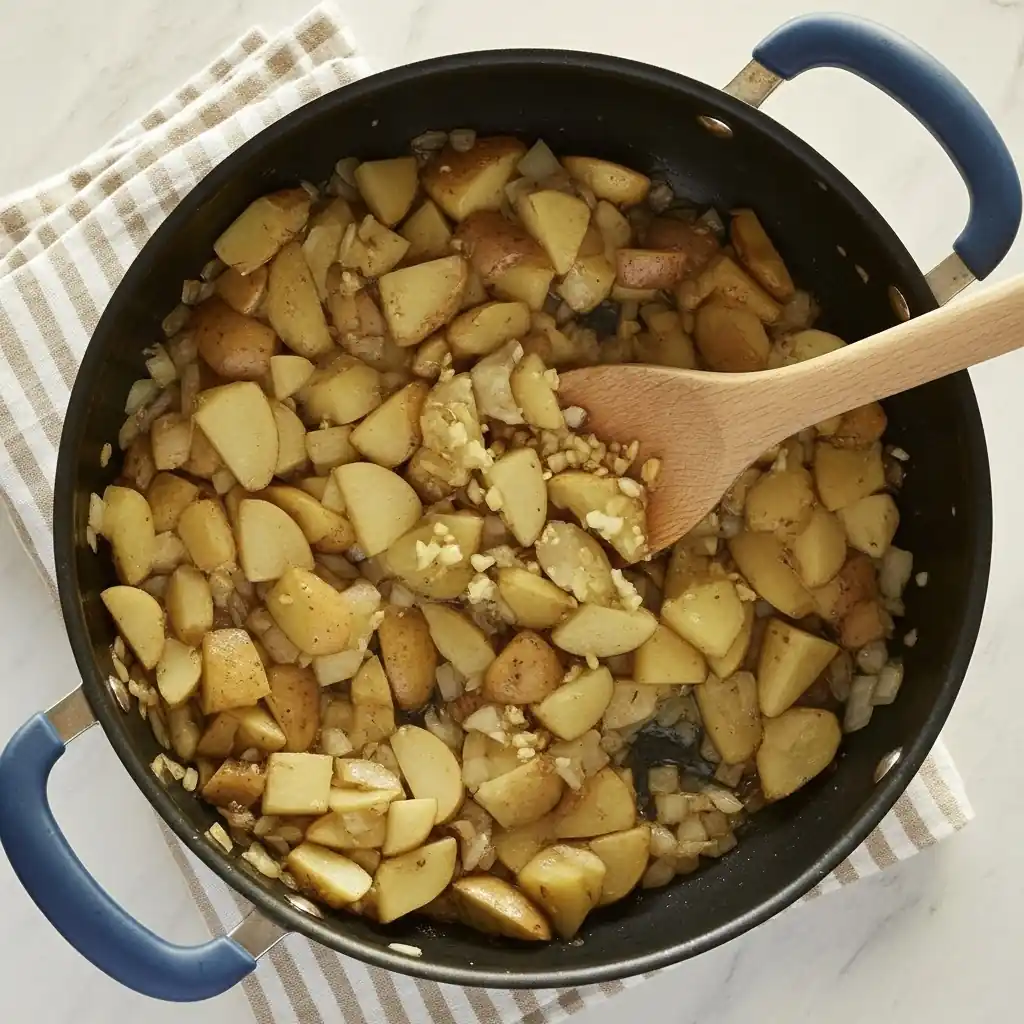 4. Add the diced potatoes and bay leaf. Pour in 3 cups of vegetable broth, or just enough to cover the potatoes. Bring to a gentle boil, then reduce the heat and simmer 10–12 minutes, or until the potatoes are fork-tender but not falling apart.
