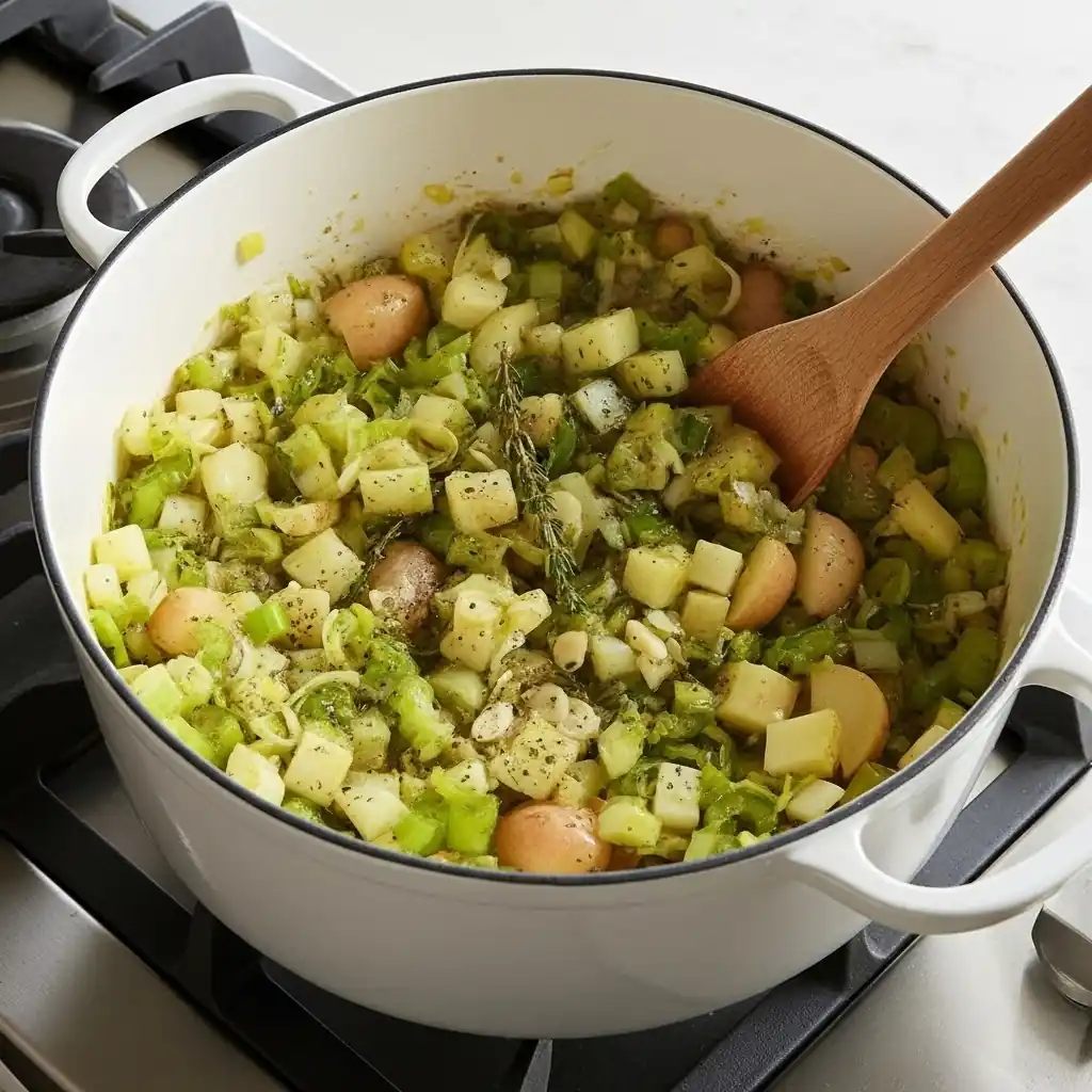 - Sauté aromatics (10–12 min): Add leeks, celery, garlic, potatoes, thyme, herbes de Provence, salt, and pepper. Stir until leeks are translucent and potatoes start to soften; edges will look glossy.