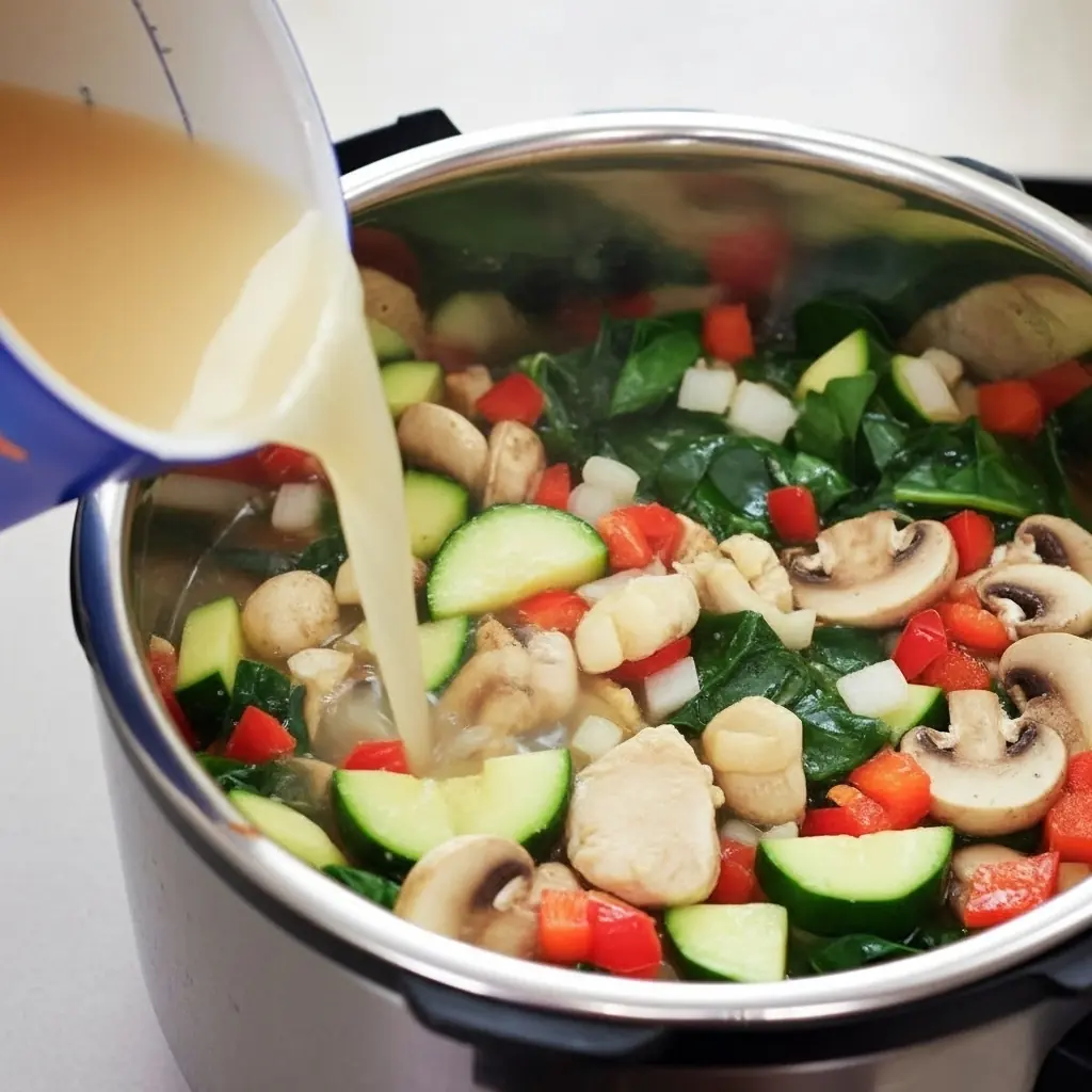 - Pour in the broth and simmer. Add all 8 cups of chicken broth and bring the mixture to a gentle boil. Reduce the heat to a simmer and cook for about 10–12 minutes, until the chicken is cooked through and the vegetables are mostly tender.