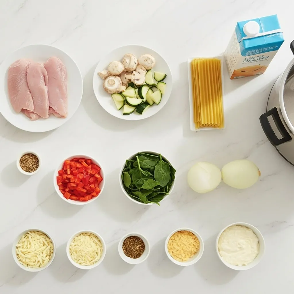 You can absolutely get ahead on this lasagna soup. Up to 1–2 days in advance, chop all the vegetables, cube the chicken, and even mix the cheeses and blended cottage cheese in a container. Store everything in the fridge until you’re ready to cook.