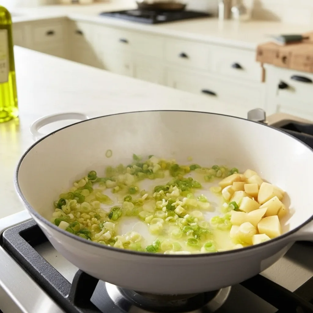 1. Sauté aromatics (build flavor): Heat olive oil over medium. Add the white/light green parts of the green onions and a pinch of salt; cook 2–3 minutes until glossy and sweet. Stir in garlic for 30–60 seconds, just until fragrant.