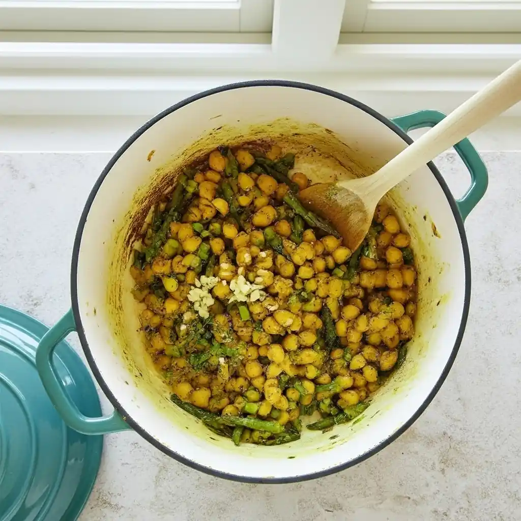 Prep aromatics, chop asparagus, and rinse chickpeas up to 2 days ahead. Store cooked soup in the fridge 3–4 days; pasta will continue to soften slightly. Freeze without the pasta for up to 3 months; reheat and add a handful of freshly cooked noodles or a can of chickpeas to refresh texture. Reheat gently on the stovetop; add a splash of stock or water and a squeeze of lemon to wake it up.