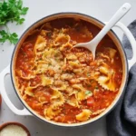 Lasagna Soup is the answer when you’re craving classic lasagna flavor without the hours of layering and waiting—then we take it one delicious step further by baking it into a sliceable casserole. The base simmers into a thick, tomato-rich soup loaded with noodles and three cheeses; then it’s poured into a baking dish, topped with ricotta and mozzarella, and baked just until set. You’ll get the cozy, creamy spoon-comfort of soup plus the satisfaction of neat, cheesy squares. Perfect for busy nights, meal prep, and anyone who loves Easy Fall Soup Recipes and Easy Dinner Recipes that don’t feel like shortcuts.