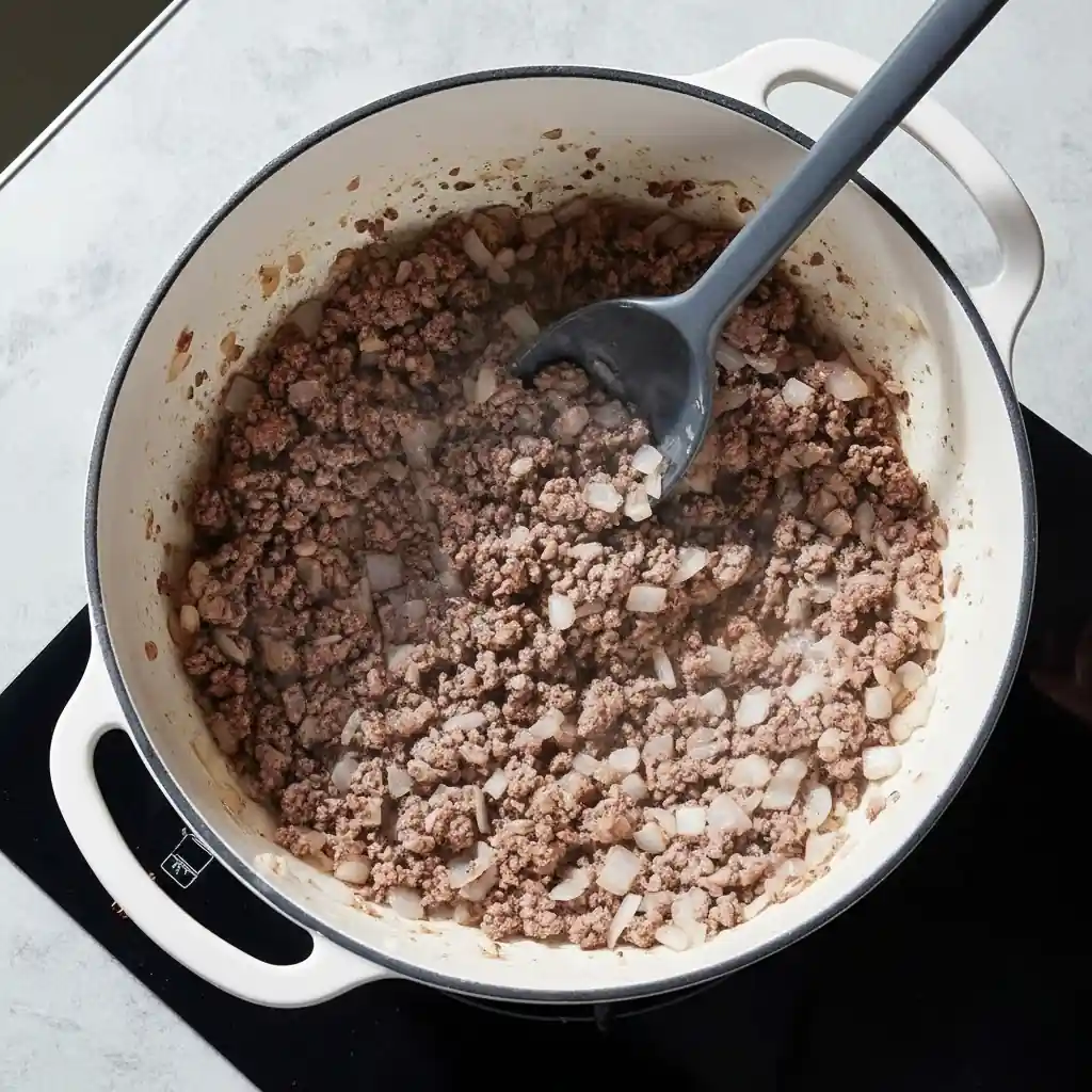 1. Brown & build flavor (5–7 min): Heat oil over medium-high. Add beef and onion; cook until the meat is browned and onions translucent. Season with salt and pepper. (Visual cue: browned bits on the pot.)