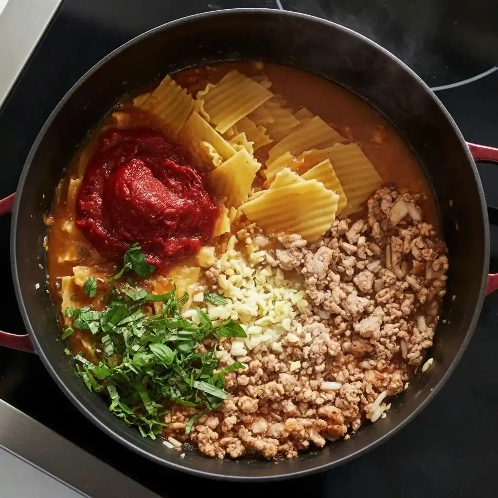 5. Pasta cook (10–12 min): Add broken lasagna noodles. Stir occasionally to prevent sticking. Cook until just al dente. Visual cue: noodles bend easily with firm center.