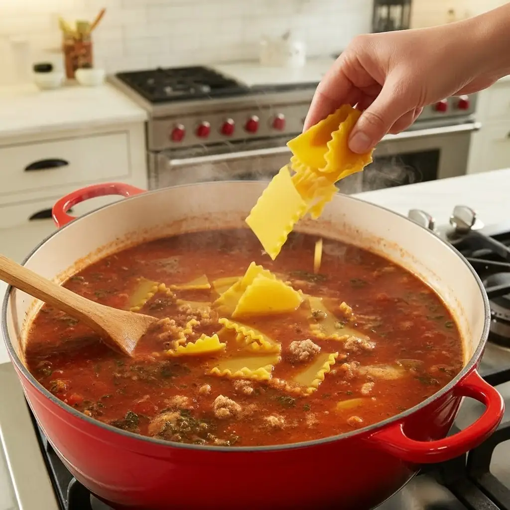 - Add pasta (12–15 minutes): Drop in broken lasagna noodles. Simmer, stirring occasionally, until al dente—noodle edges should be tender with a slight bite.