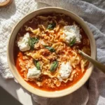 Cozy, high-protein Lasagna Soup made in one pot with ground chicken, tomatoes, broth, lasagna noodle pieces, and a creamy ricotta–mozzarella topping. Meal-prep friendly, reheats beautifully, and packs bold tomato-herb flavor with minimal effort.