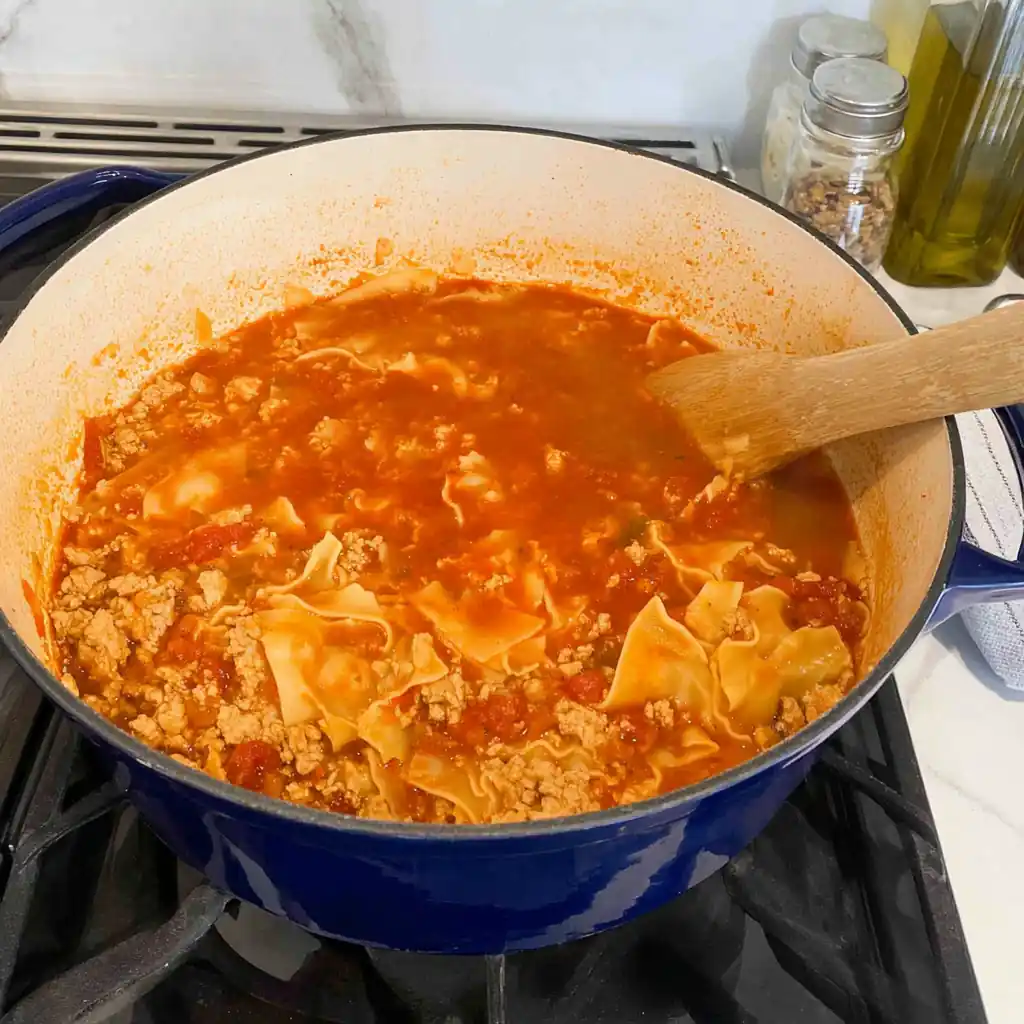 Bring to a simmer. Add lasagna noodle pieces and cook 12–15 minutes, stirring occasionally, until tender. Add extra broth if needed.
