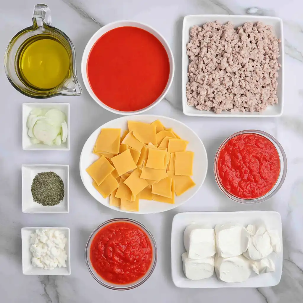 Must-have vs. flexible: Must-haves are the onion, garlic, tomatoes, broth, noodles, and some form of creamy cheese. Flexible: the specific protein, herb blend, and mozzarella vs. ricotta ratio.