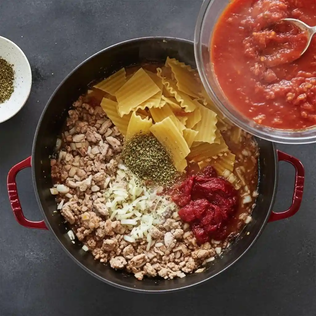 - Liquids & Simmer (12–15 min): Pour in broth and crushed tomatoes; scrape up browned bits. Bring to a boil, then reduce to a steady simmer.