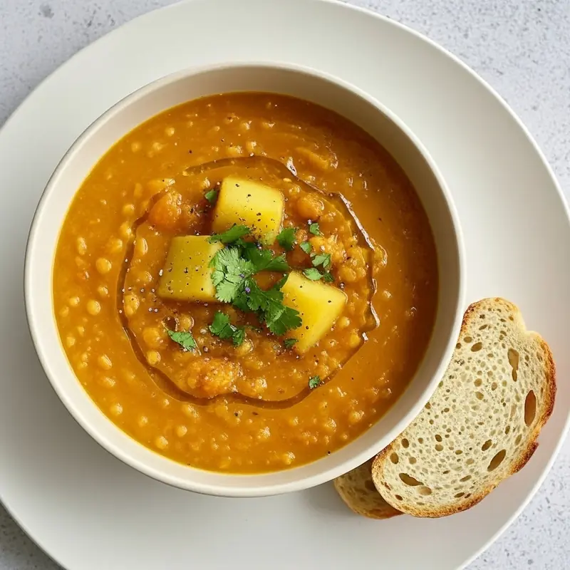 Creamy potatoes meet protein-rich red lentils for a filling, family-friendly bowl. The lentils thicken the soup naturally while adding body and nutrition. Season with paprika and thyme, then finish with lemon and parsley. It’s a satisfying one-pot dinner that welcomes crusty bread.
