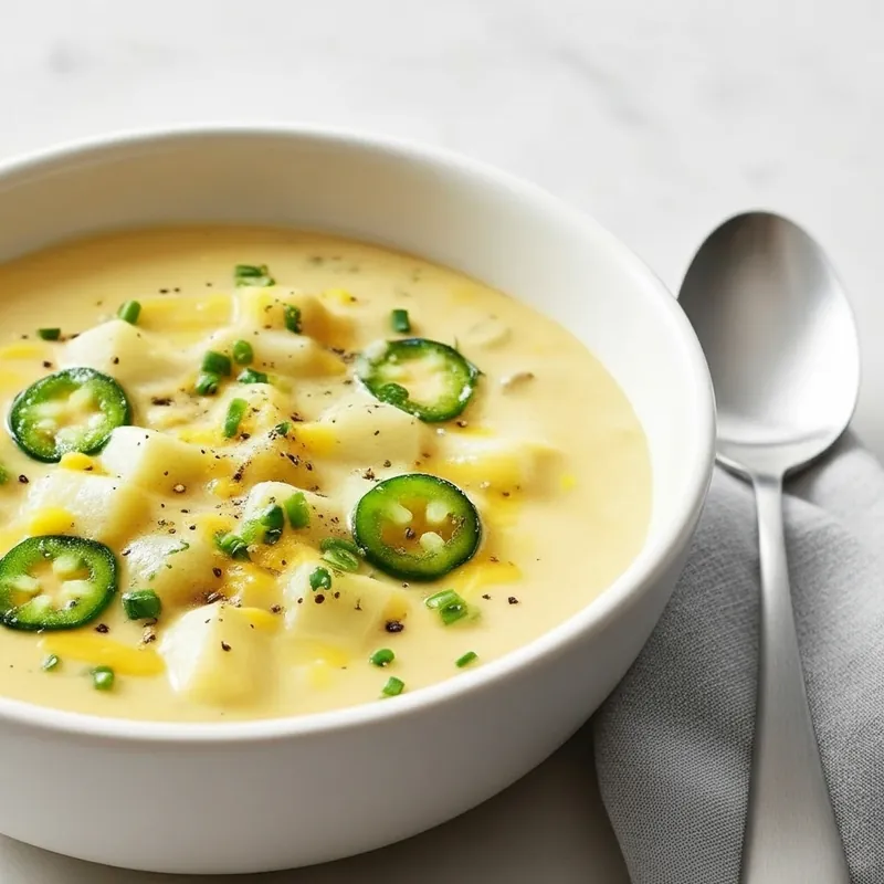 Creamy meets zesty. Sauté jalapeños with onions for mellow heat, simmer potatoes, then stir in shredded cheddar off the heat so it melts into silk. Finish with a little lime and cilantro for pop. Add more jalapeño rings on top if you like it bold.