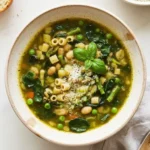 Light, brothy, and packed with spring vegetables, this Spring Green Minestrone with Lemon & Peas is cozy without being heavy. A fragrant herb broth, tender pasta, creamy white beans, and bright asparagus, spinach, and peas come together in one pot, finished with pesto, aged cheese, and a squeeze of lemon for a clean, lively flavor that works for easy weeknights or relaxed Sunday soups.
