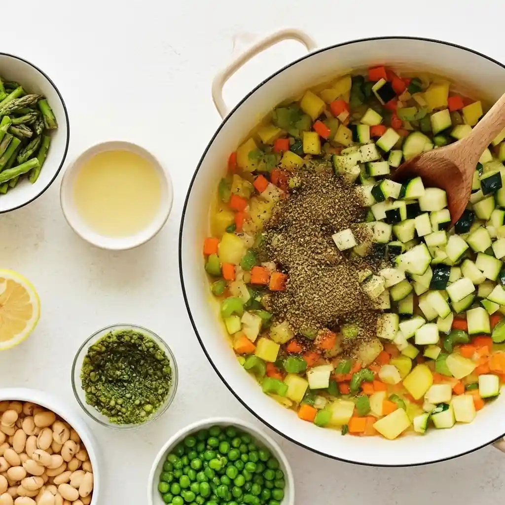 Olive oil: blooms aromatics. Onion/carrot/celery: sweet base. Potato: body. Garlic: aroma. Zucchini: freshness. Italian seasoning: herbal backbone. Salt/pepper: balance. Vegetable broth: clean canvas. Cannellini: creaminess and protein. Small pasta: comfort and heft. Spinach/asparagus/peas: spring color and snap. Aged cheese: savoriness. Pesto: herby richness. Lemon juice: brightness. Basil: fresh finish.
