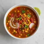 Taco Soup becomes the easy answer when weeknights are crowded and you need dinner that’s hearty, bright, and fast. This vegan lentil & corn version layers a smoky chili–cumin base with quick-cooking red lentils for satisfying plant protein, then finishes with lime, scallions, and crisp radish for freshness and crunch. The flavor rides that perfect line between cozy and lively: a tomato-chile broth with gentle heat, sweet pops of corn, and a squeeze of citrus that wakes everything up. If you’re cooking for mixed eaters or a family, this is the type of bowl that earns repeat requests and friendly “save the recipe” texts the next day. It’s budget-smart, pantry-friendly, and made in one pot—exactly the kind of Healthy Taco Soup that makes Tuesday feel like a small victory.