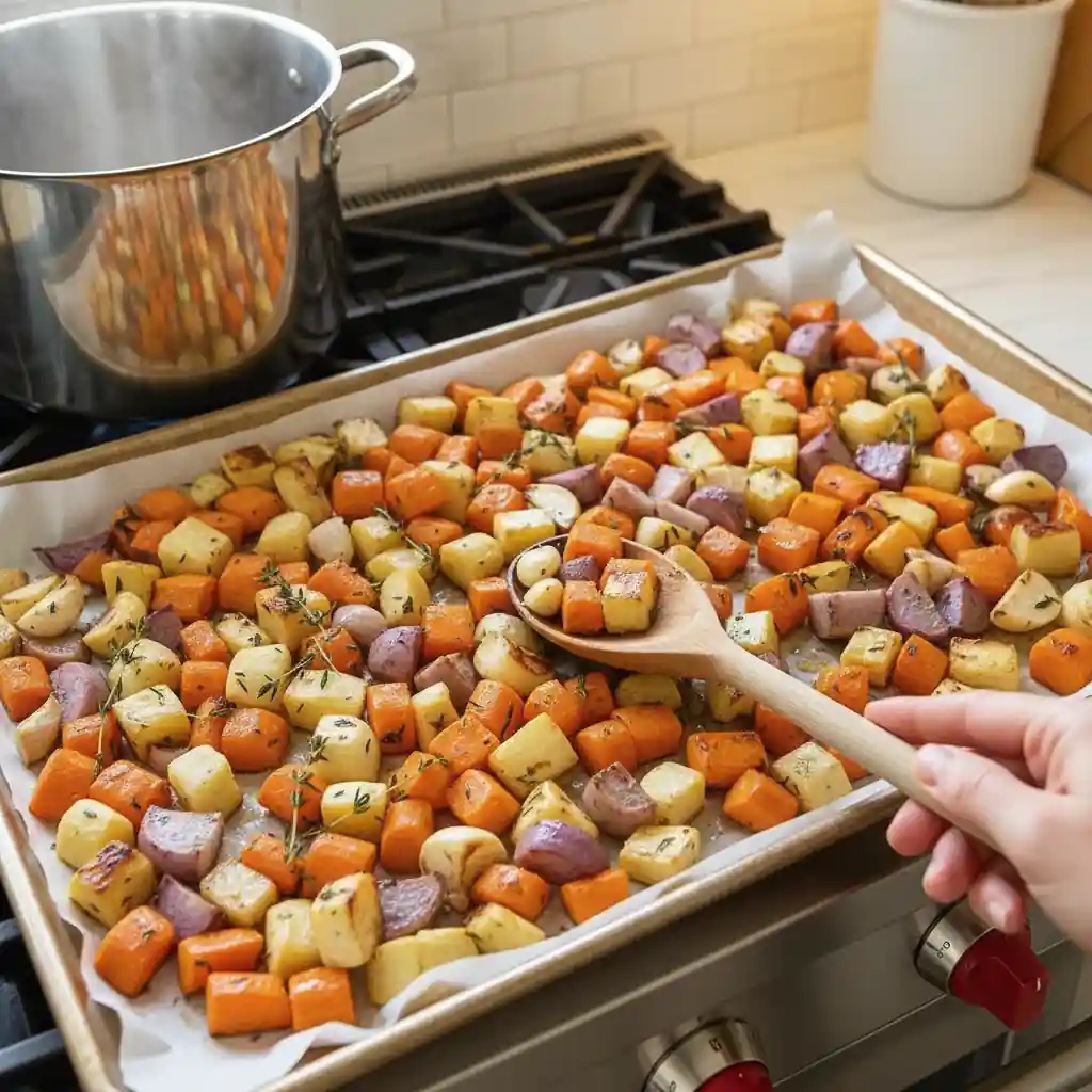If the texture is too thick, whisk in warm water or broth, a little at a time, until it reaches your ideal consistency. Too thin? Simmer uncovered for a few minutes to reduce or add a spoonful of mashed root vegetables from the pan. If the vegetables roasted a bit too hard, blend them thoroughly and finish with extra olive oil for smoothness.